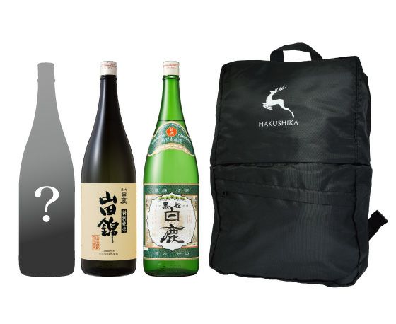 白鹿1.8L瓶のお酒とシークレットのお酒に、オリジナルデザイン入りのリュックサックとショルダーバック、