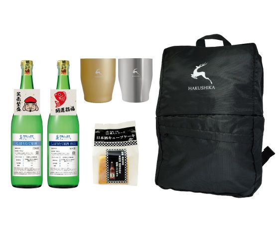 白鹿のお酒を使用している「日本酒キューブケーキ」、オリジナルデザイン入りのリュックサックとショルダーバック、2つのスタイルを使い分けるできるバッグ、